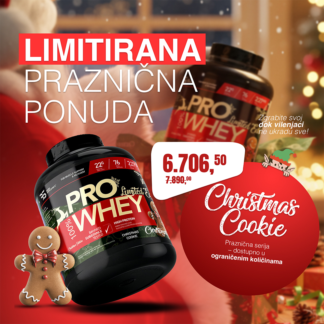 Uđi u praznični duh uz PRO WHEY – Christmas Cookie LIMITED EDITION! Ova posebna, sezonska verzija jednog od najtraženijih proteina donosi savršen balans vrhunskog whey koncentrata i neodoljivog ukusa prazničnog keksića. Dostupan je SAMO u ograničenim količinama, i biće u prodaji dok god ima zaliha.