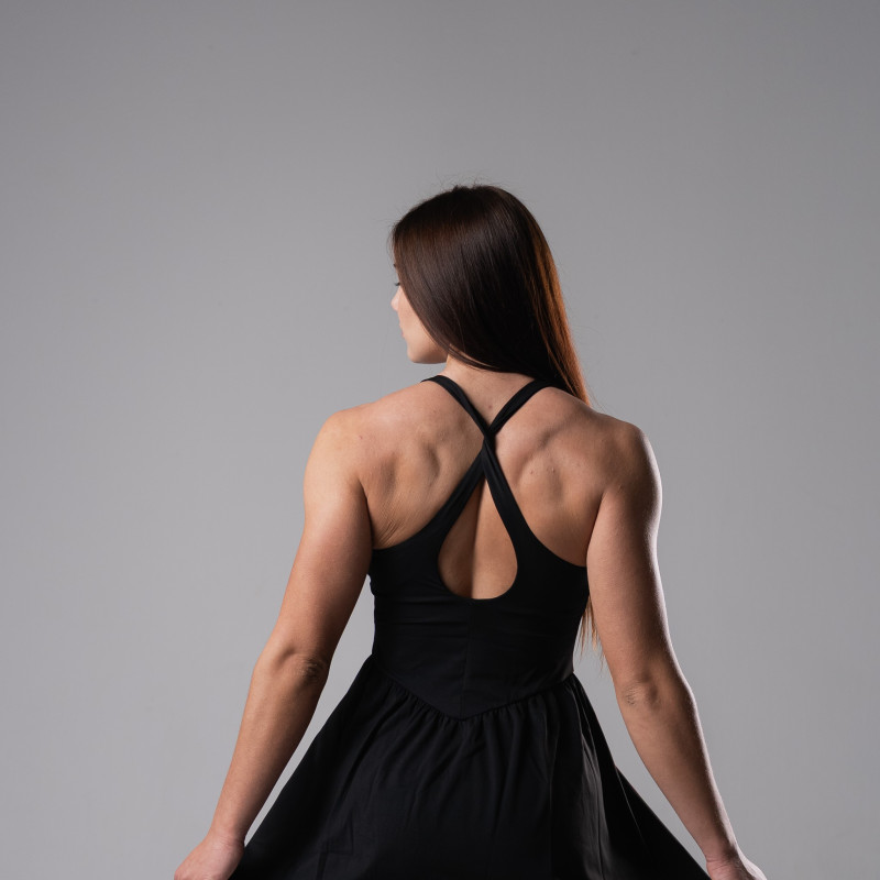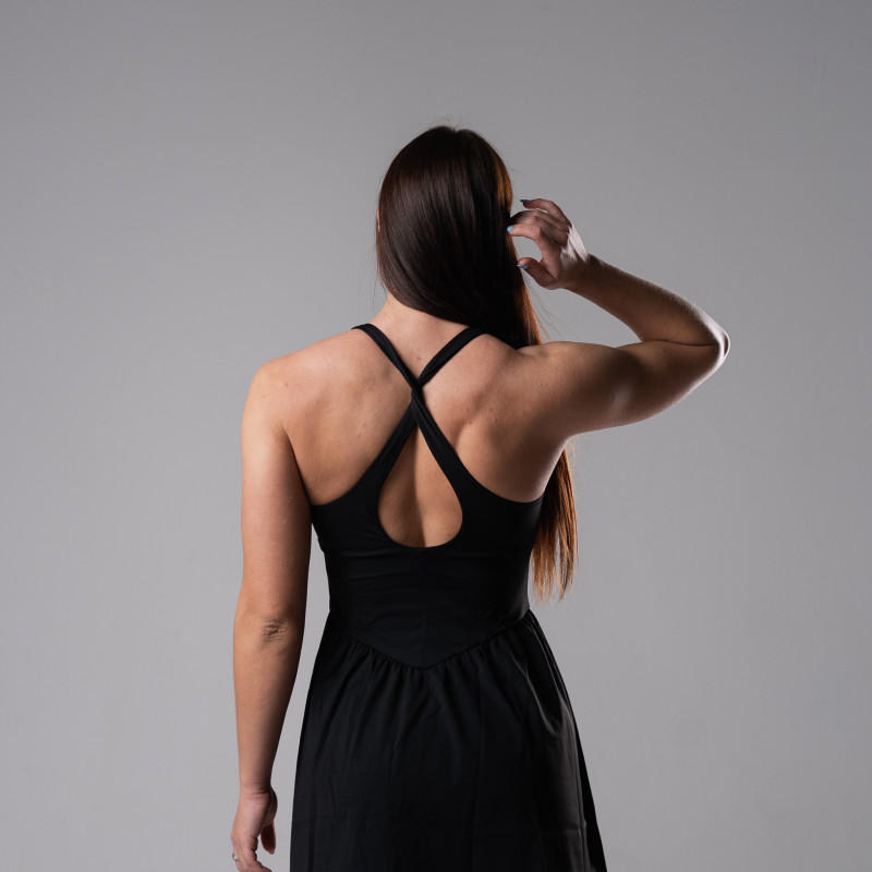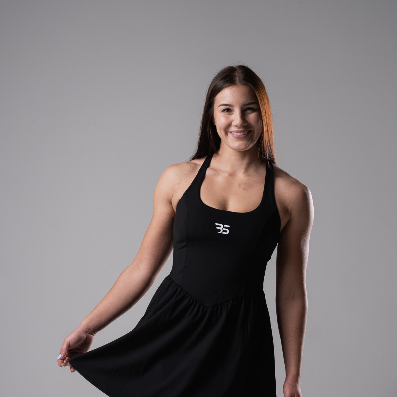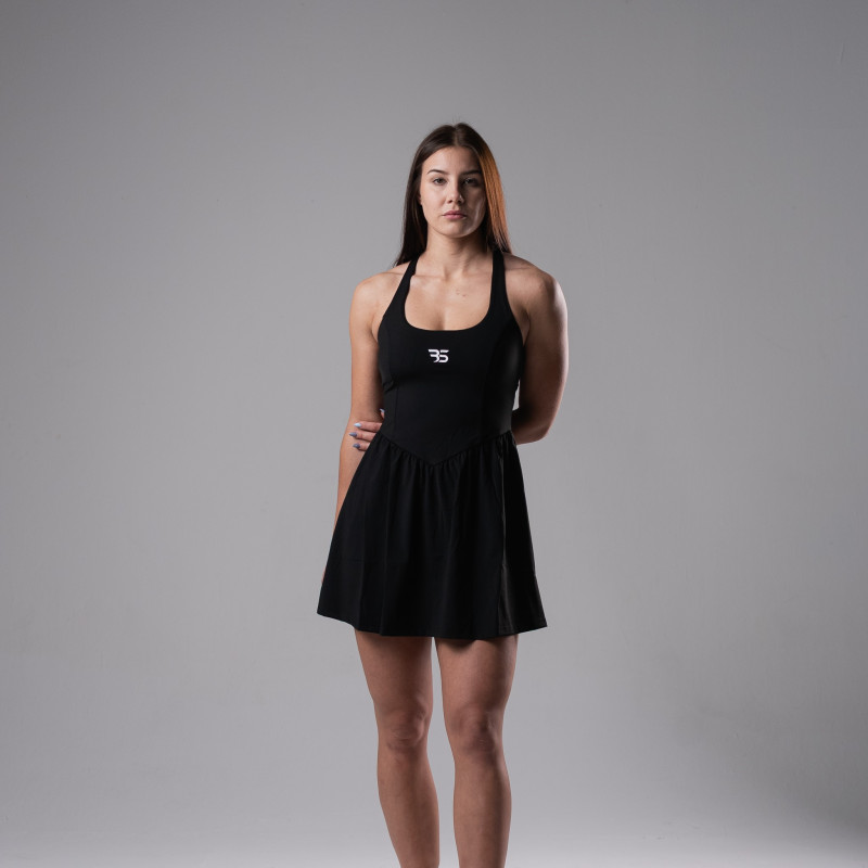 Kroj haljine oblikuje gornji deo tela, dok se suknja prirodno širi i stvara elegantnu, dinamičnu siluetu. Bilo da trenirate ili provodite dan u pokretu, izgled ostaje uredan i moderan.