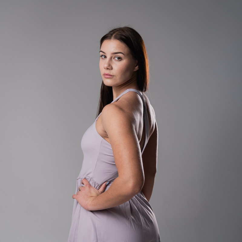 Kroj haljine oblikuje gornji deo tela, dok se suknja prirodno širi i stvara elegantnu, dinamičnu siluetu. Bilo da trenirate ili provodite dan u pokretu, izgled ostaje uredan i moderan.