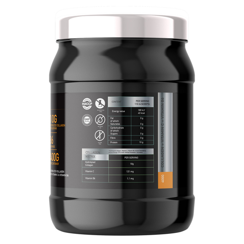 Hidrolizovani goveđi kolagen, regulator kiselosti (limunska kiselina), aroma narandže, aroma jagode, l-askorbinska kiselina (Vitamin C), zaslađivač (sukraloza), piridoksin-hidrohlorid (Vitamin B6).