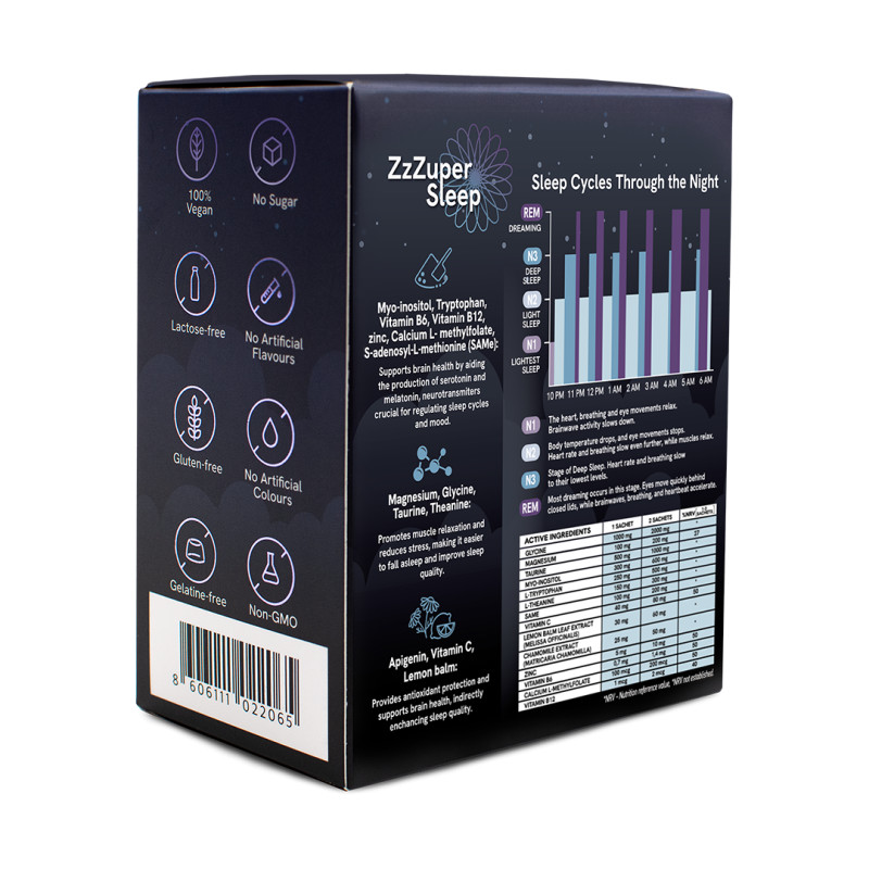 ZzZuper Sleep je jedinstvena mešavina prirodnih sastojaka kao što su L-triptofan, magnezijum, glicin, teanin, kamilica i matičnjak, dizajnirana da poboljša kvalitet sna i olakša uspavljivanje.