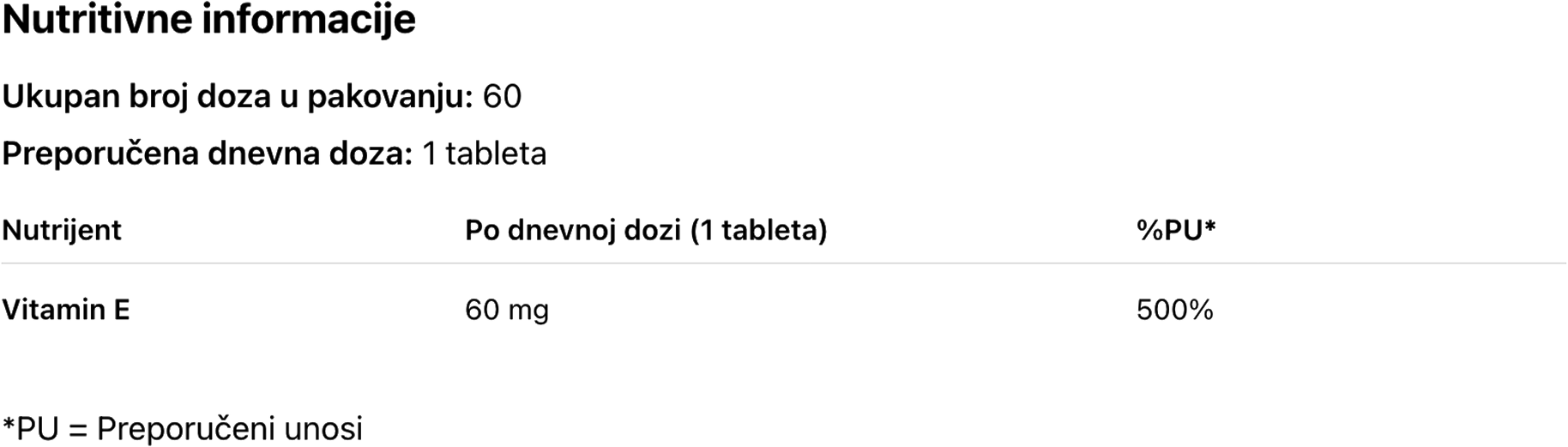 Vitamin E je esencijalni, liposolubilni vitamin poznat po svojoj snažnoj antioksidativnoj moći, zahvaljujući kojoj štiti ćelijske membrane od oštećenja izazvanih slobodnim radikalima. Ova jedinstvena formula bazirana je na alfa-tokoferolu – obliku koji ljudski organizam najbolje koristi.